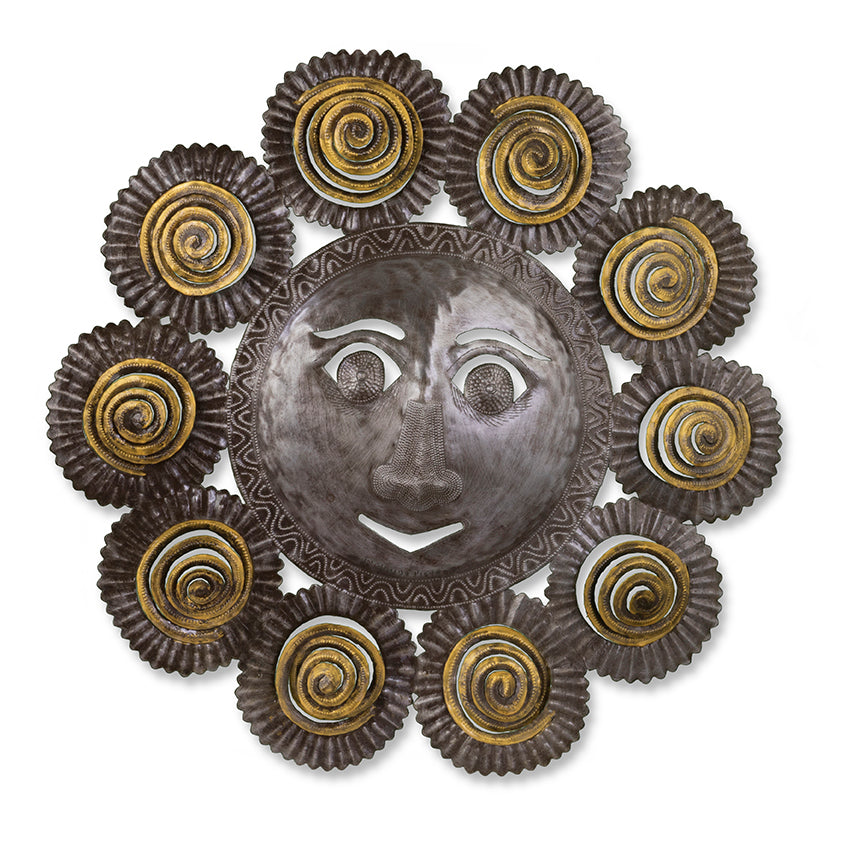 This sun is having too much fun… totally surrounded by golden painted curls and seem to blossom! Crafted by Jeanclaude Pierre.
