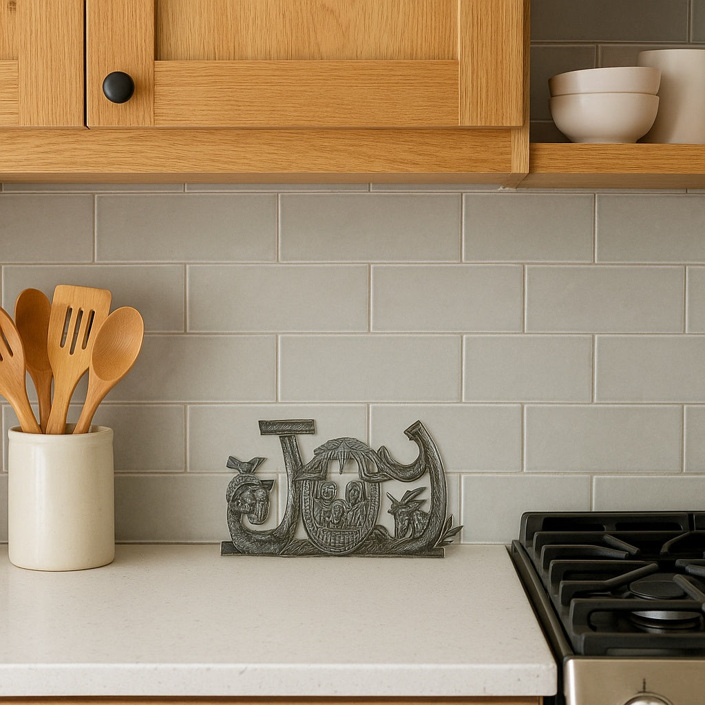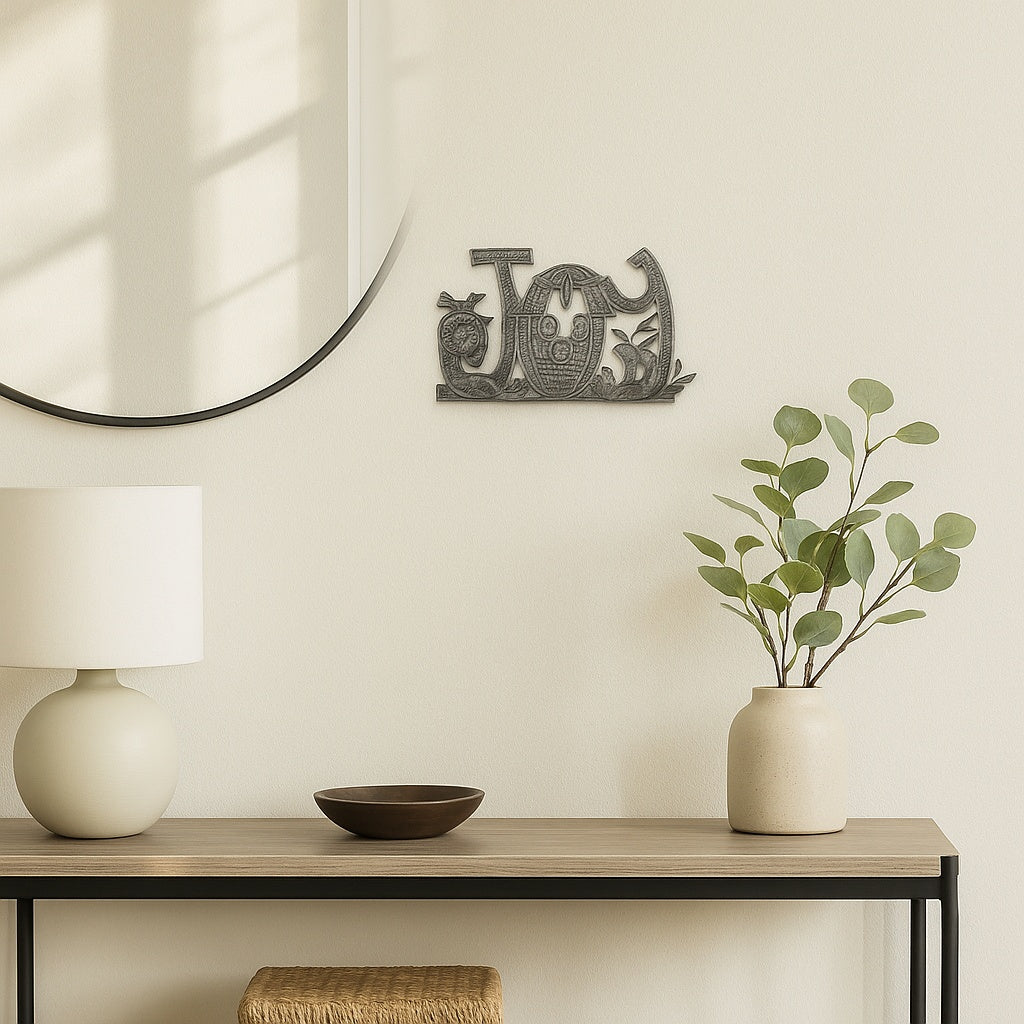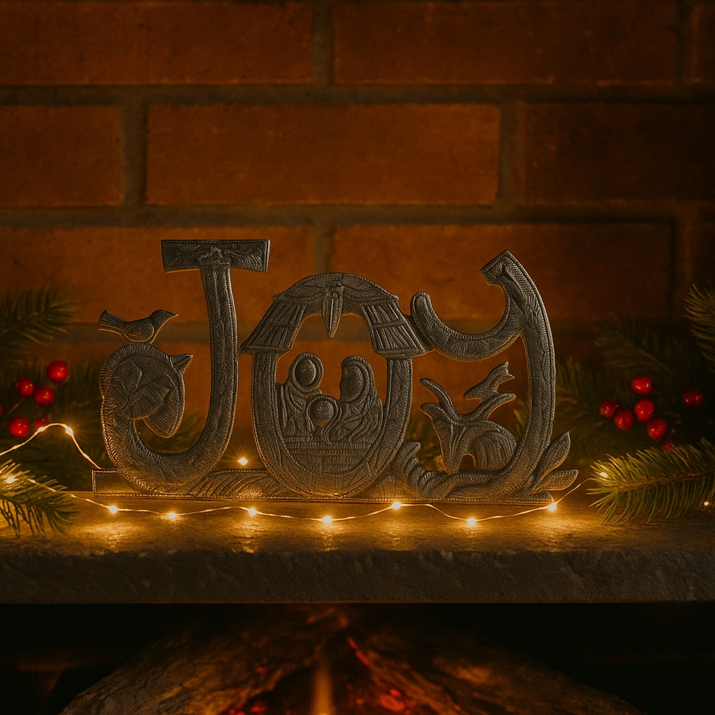 Handmade Metal Nativity “JOY” Wall Art – Haitian Artisan Christmas Decor.